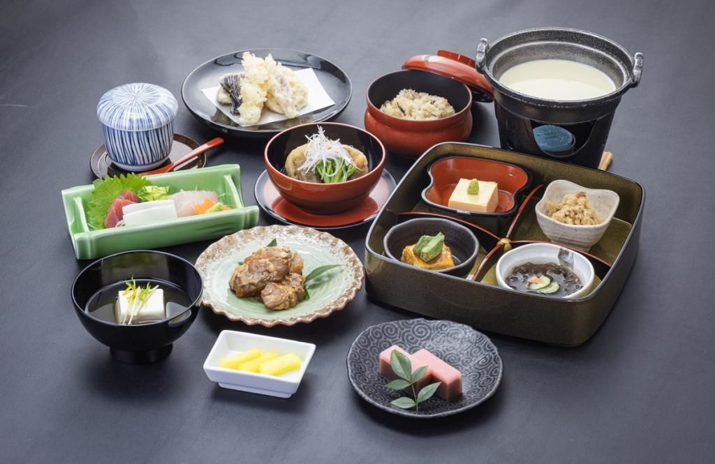 じーまーみ豆腐揚げ出し・卯の花・玉子豆腐・もずく酢・手作り豆腐・県産金目鯛大根おろし煮・旬海鮮三種盛り・よもぎ麩といんげんのかき揚げ・軟骨ソーキ照り焼き・茶碗蒸し・じゅうしぃ・県産野菜彩り香の物・おぼろ豆腐・県産さつま芋羊羹浮島