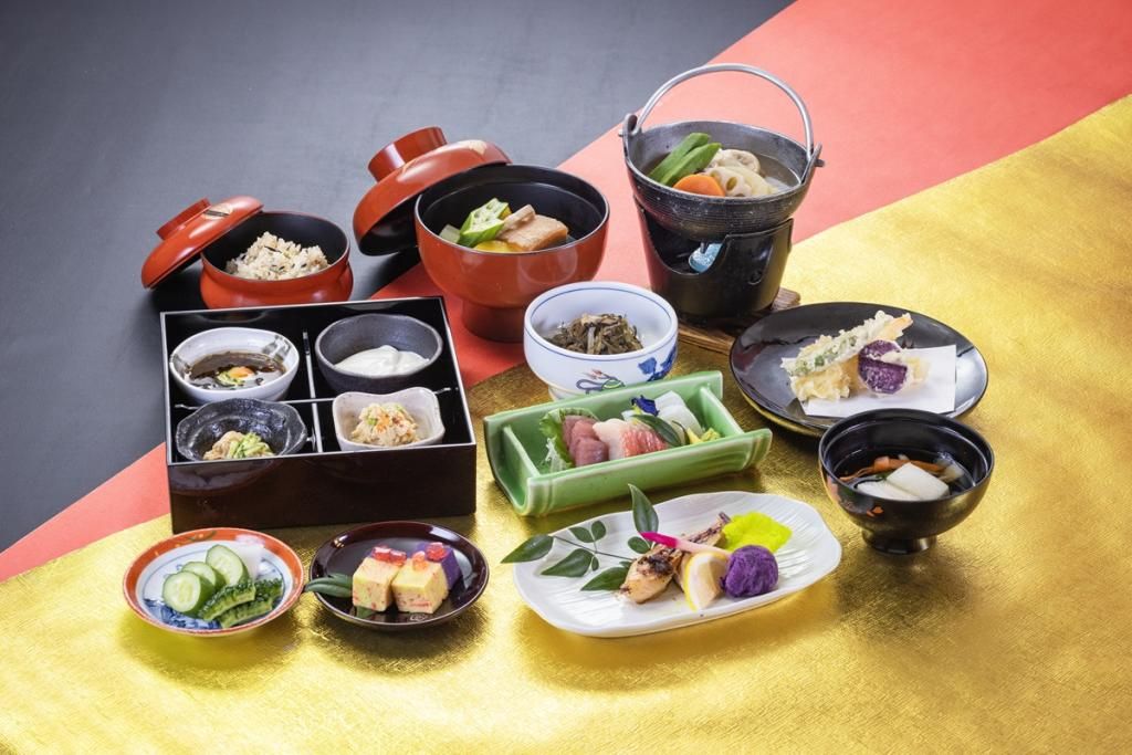 もずく酢・じーまーみ豆腐・卯の花・みみがー・旬海鮮三種盛り・クーブイリチー・らふてぃ 県産野菜炊合せ・天麩羅三種盛り・てびち鍋(+880円で金アグー豚陶板焼きに変更)・県産金目鯛西京焼き・じゅうしぃ・県産野菜彩り香の物・冬瓜えび身上葛たたき椀・県産さつま芋羊羹浮島