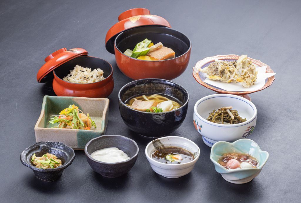 もずく酢・じーまーみ豆腐・卯の花・らふてぃ 県産野菜炊合せ・ぐるくんの彩りあんかけ・よもぎ麩といんげんのかき揚げ・じゅうしぃ・沖縄そば・県産野菜彩り香の物・甘菓子